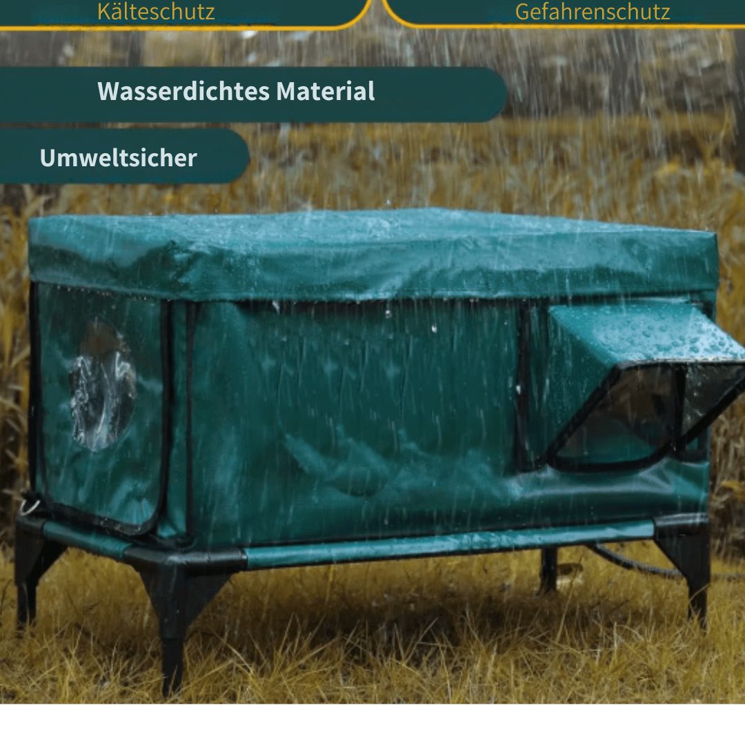 Das Haus verfügt über eine integrierte Heizmatte mit sicherer Niedervolt-Technologie. Einfach an die Steckdose anschließen – die Matte sorgt für angenehme Grundwärme.